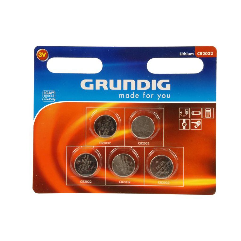 Set of 5 flat button batteries Grundig - CR2032. This lithium battery has a voltage of 3V. Suitable for watches, calculators, etc. Diameter 20 mm, height 3 mm.Additional parameters