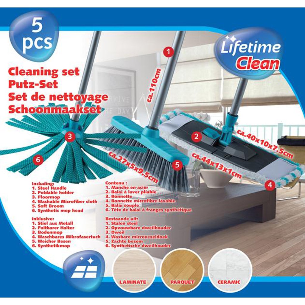 Cleaning set includes:1 x flat mop - dimensions 40 cm x 10 cm x 7,5 cm