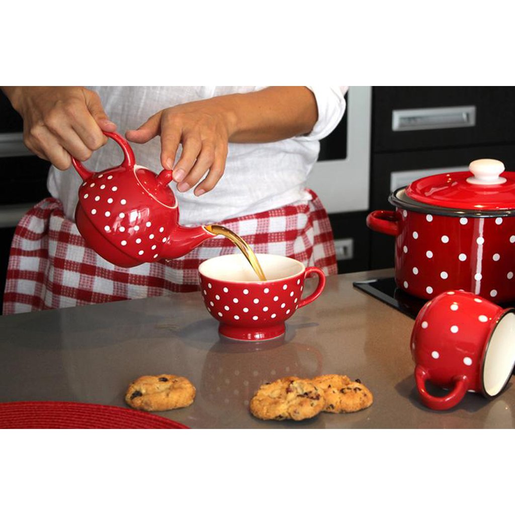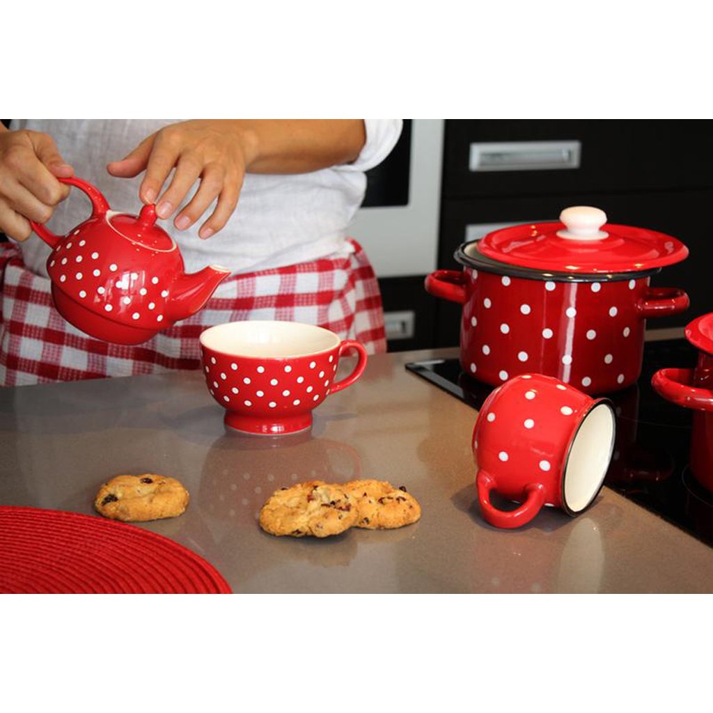 Enamel has been used in the kitchen for many years. The enamel pot is an excellent tool for preparing all kinds of dishes, but you can also use it as a decorative element that will bring a piece of cheerful mood to any house or cottage. It is suitable for all types of cookers, including induction. The pot has 2 practical handles for easy handling. This enamelled pot is available in red with a white dot and has a capacity of 2 litres.Additional parameters