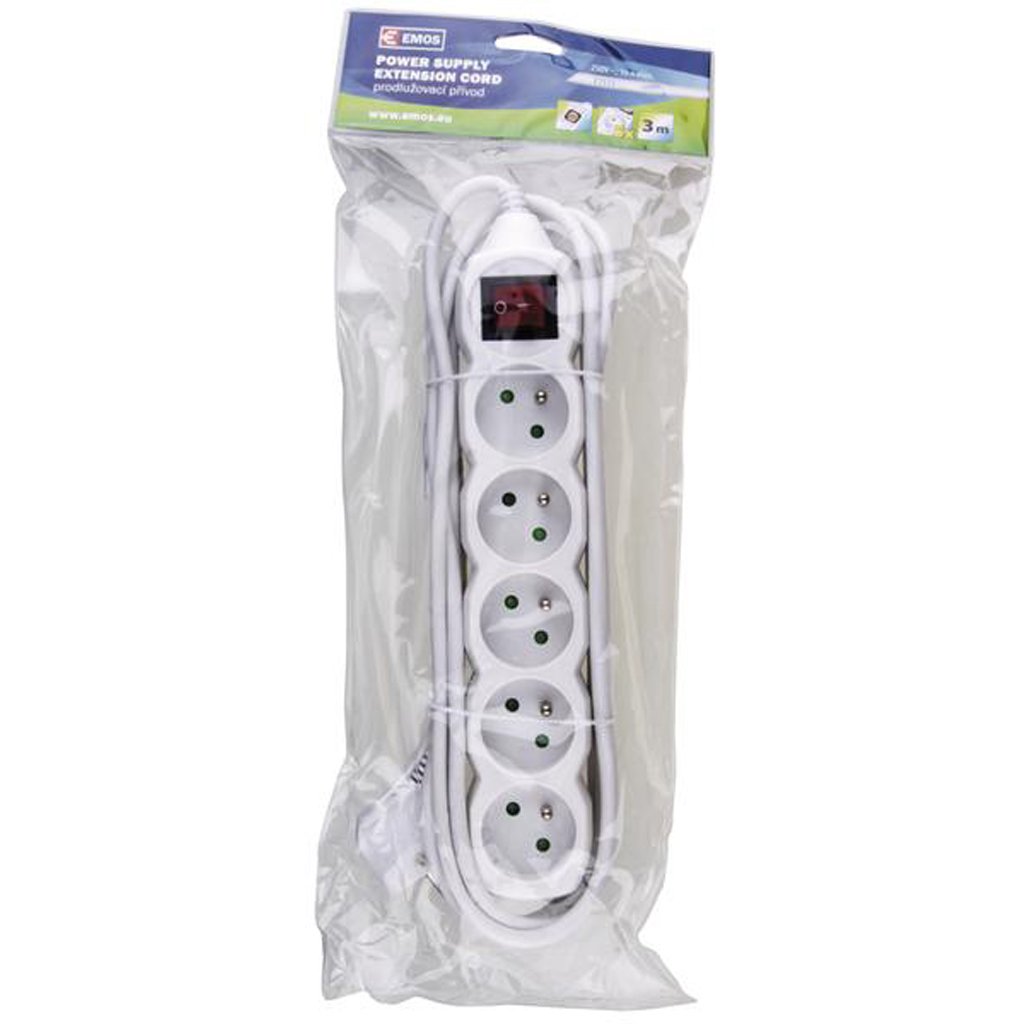 Extension cable with switch 5 plugs 3 M, WHITEThe extension cable with switch is made of durable plastic and rubber. These are classic sockets - type E for 230V / 50 Hz. The maximum load of the cable is 2300 W, it has 5 sockets and the cord length is 3 m.Additional parameters