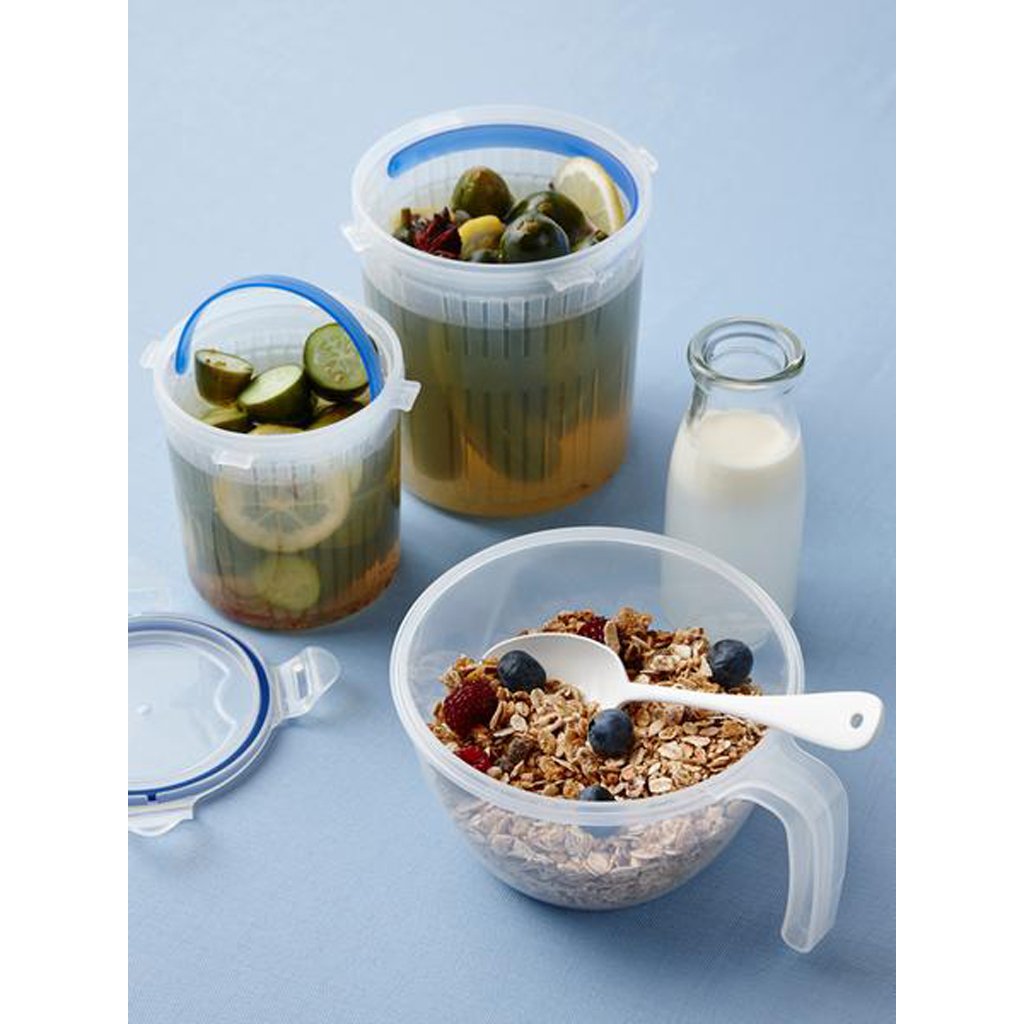 Lock jars are safe and functional containers, made of high quality plastic that is durable and can withstand high temperatures. These jars are 100% airtight and thus ensure the long-term freshness of the stored food and are also excellent in terms of aroma preservation.The four movable "clips" securing the lid are wear-resistant. The containers have a specially treated outer bottom so that they can be stacked safely and do not slip.