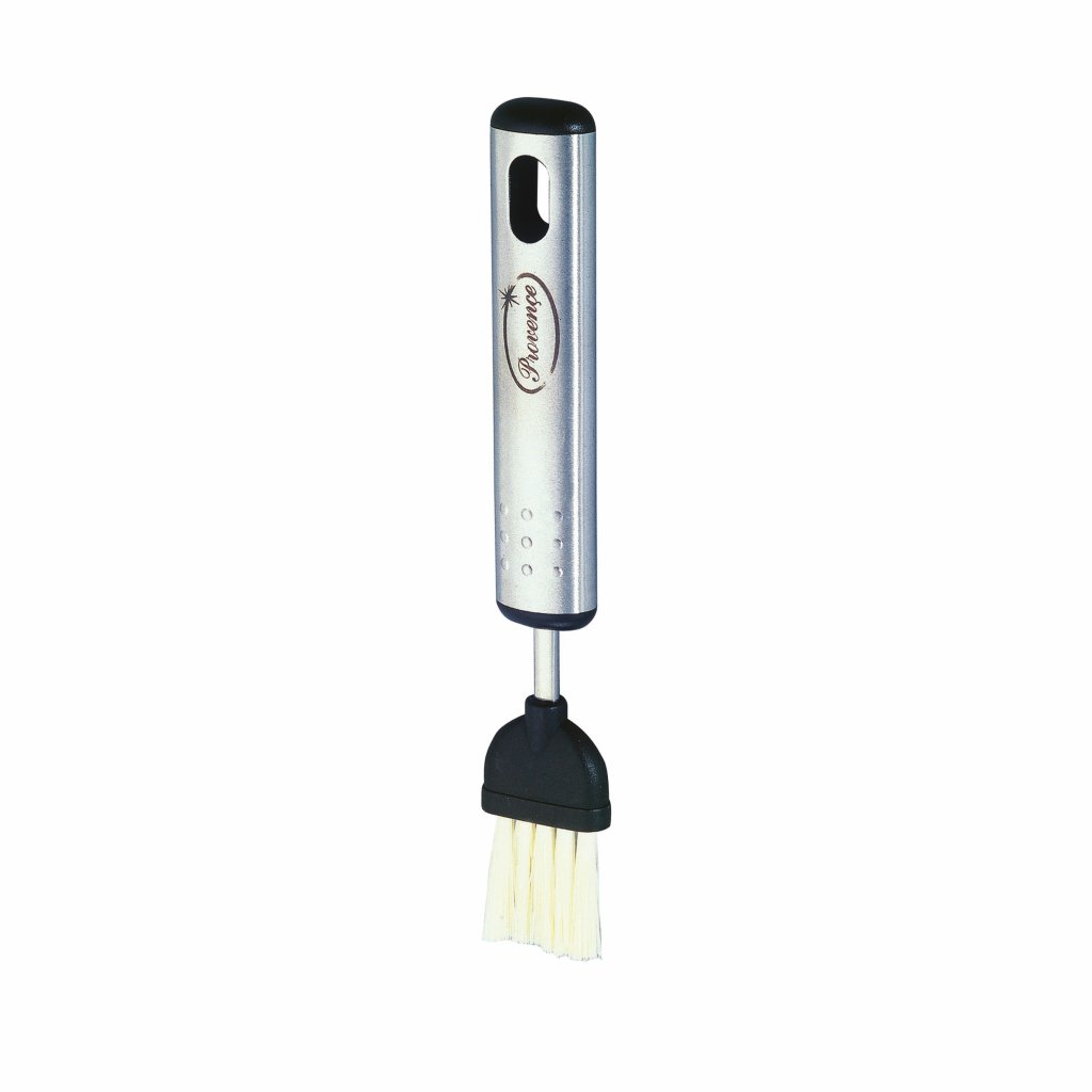 Butter knife 18, 4 cm, made of matt 18/8 stainless steel in combination with high quality black plastic, artificial bristles, handle with hanging hole, practical helper for baking and grilling. Dishwasher safe. Dimensions - 18, 4 x 2, 6 cm.Additional parameters