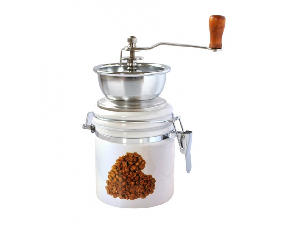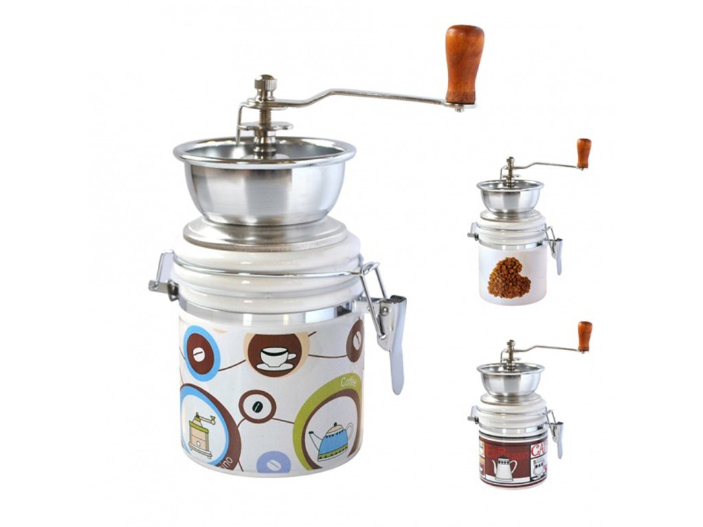 Hand grinder with a modern coffee motif with a closable container. The body of the grinder, which has a patent closure, is made of porcelain, the grinding mechanism of stainless steel alloys and the ergonomic handle of wood. Any grinding coarseness can be adjusted. The grinder is also suitable as a decoration. Dimensions of the grinder - 8,5 x 8,5 x 17 cm.Additional parameters