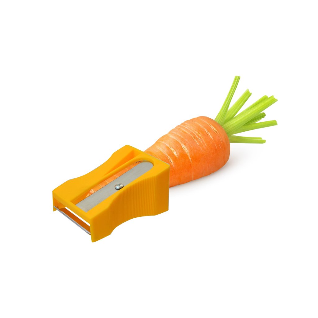 Pencil sharpener and greens scraper. Easily clean vegetables with it. The pencil sharpener is mainly used for root vegetables. The peeler is for other vegetables. Material - plastic, stainless steel. Dimensions - 7,6x5,3x3,8 cm.Additional parameters