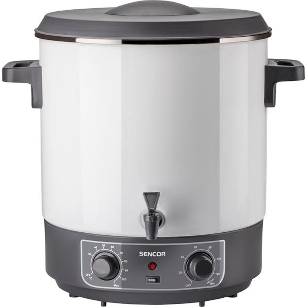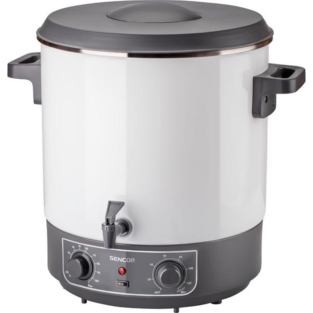Features: designed for canning and sterilizing fruits and vegetables, also suitable for preparing soups, hot drinks or sauces, enamelled surface for easy maintenance, spout for pouring drinks, heat-insulated handles against burns, hidden heating element, 2 canning modes ? adjustable switch and continuous function, continuously adjustable thermostat 30?100 °C, automatic temperature control, capacity of 14 1 litre jars, audible alarm when set temperature is reached, overheat protection, overheat protection during idle operation